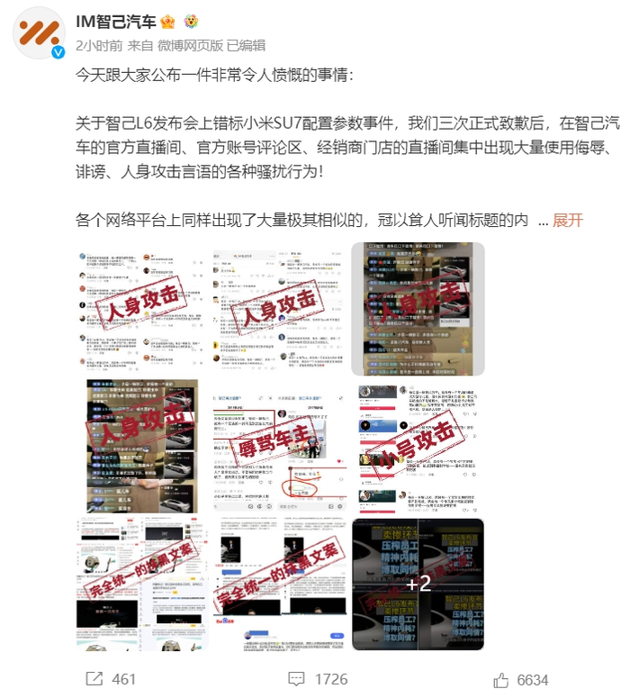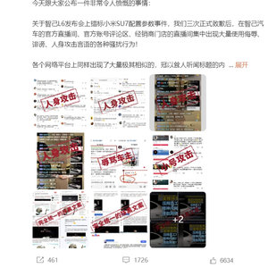 关于智己L6发布会上错标小米SU7配置参数事件,我们三次正式致歉后,在智己汽车的官方直播间、官方账号评论区、经销商门店的直播间集中出现大量使用侮辱、诽谤、人身攻击言语的各种骚扰行为!
