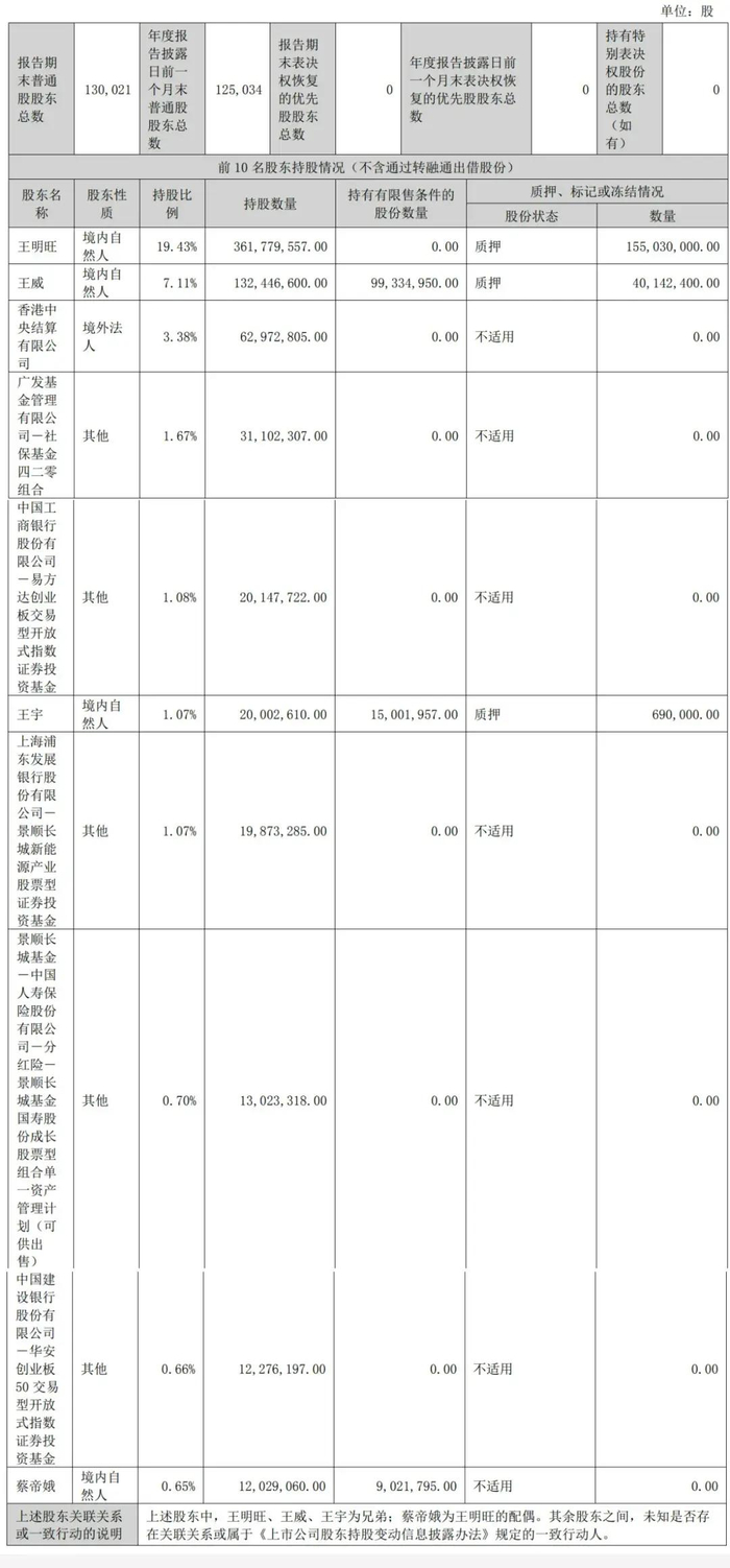 截至2023年12月31日,王明旺持有欣旺达19.43%股权,王威持股为7.11%,香港中央结算有限公司持股为3.38%,广发基金管理有限公司-社保基金四二零组合持股为1.67%;