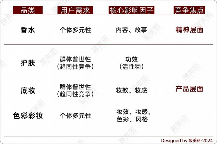 刚说了香水与彩妆品类在发展阶段层面的早期不成熟性,有相似之处,但是我们也知道,从品类的底层属性,两者是有一定区别的。我们把香水与护肤,香水与彩妆做个简单的比较。