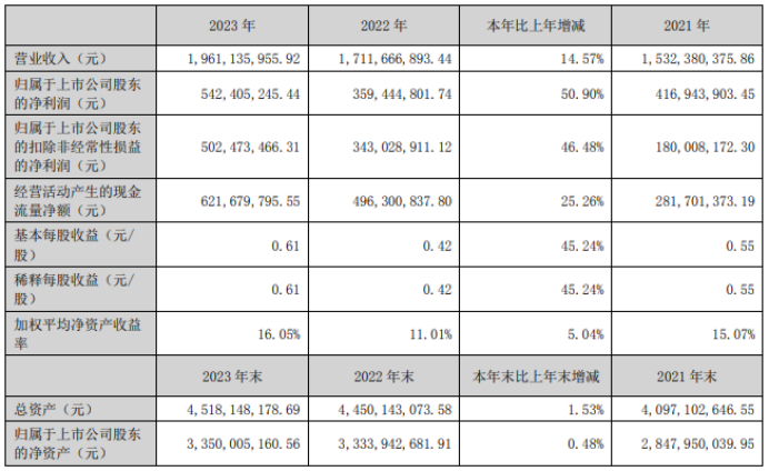 挖贝网4月10日,华明装备 近日发布2023年年度报告,报告期内公司实现营业收入1,961,135,955.92元,同比增长14.57%;归属于上市公司股东的净利润542,405,245.44元,同比增长50.90%。