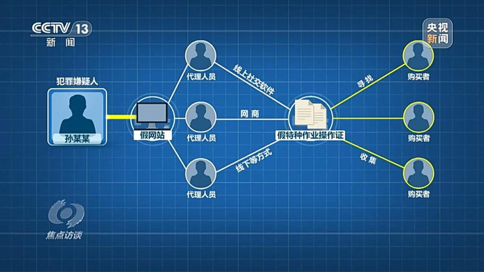 据介绍,犯罪嫌疑人孙某某是最上游,他首先花钱雇人制作了假网站,然后发展多名代理人员,代理通过线上社交软件、网商和线下等方式,兜售假网站,寻找、收集花钱购买假的特种作业操作证的人员。这些收集来的信息,汇总到孙某某这里,由他发指令给专门负责制作假证件的人。制作好的假证,发送给相应的下线代理人员,最后到购买者手里。