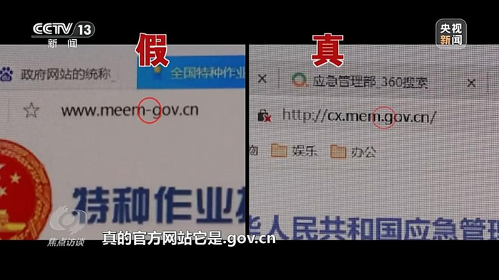北京铁路运输检察院副检察长 刘祯元:真的官方网站和假的对比,首先可以看到网址,真的官方网站是 .gov.cn ,同时搜索引擎前面会有一个党政机关的认证,进到这个网站之后可以发现,真网站可以提供电子证书下载,假的网站就没有这个功能。