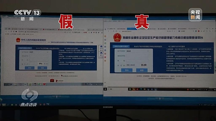 应急管理部执法工贸局副局长 吴俊荣:第一类是“真的假证”,主要指不法分子伪造的假证件,在政府的查询网站上无法查询到;第二类假证就属于“假的真证”,是指在培训考试过程当中弄虚作假,比如在培训的时候压缩了培训时长,不按大纲进行培训或者在考试过程当中弄虚作假,甚至作弊而取得的证件。