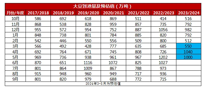 相对于巴西大豆的产量分歧而言,市场对于2023/2024年度阿根廷大豆产量的预估较为趋同,3月份市场整体预估,2023/2024年度阿根廷大豆产量在5000万吨左右。目前阿根廷核心产区大豆已经开始收割,大多数机构再次上调阿根廷大豆产量,4月份预测范围在5000万~5200万吨区间,均值在5050万吨左右,高于上一年度的2500万吨。