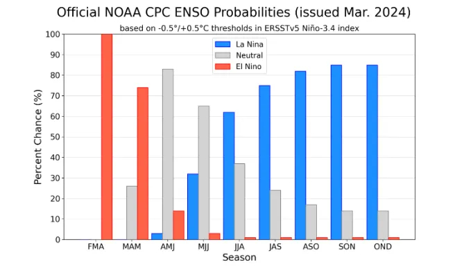 美国国家海洋和大气管理局(NOAA)数据显示,2024年4月至6月厄尔尼诺向ENSO中性过渡,ENSO中性预计持续到2024年5月至7月,6月至8月拉尼娜发生的概率较大。在拉尼娜背景下,美国大豆生长季容易出现高温少雨情况,而二季度美豆估值整体偏低,预计2024年三季度美豆天气升水交易在所难免,这也将从成本端带动我国豆粕价格走高。