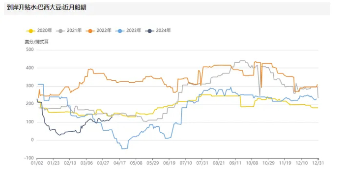 综合来看,4月USDA供需报告预计将南美三国大豆产量下调300万吨左右,至2.12亿吨左右,这一产量数值依旧是创历史纪录的,2023/2024年度全球大豆供需依旧朝向宽松方向发展。目前巴西大豆收割进度接近80%,略慢于往年同期水平,阿根廷大豆收割进度接近2%。随着南美特别是阿根廷大豆收割进度跟进,预计南美大豆卖压会在二季度逐步体现出来,届时卖方升贴水有望小幅走弱。