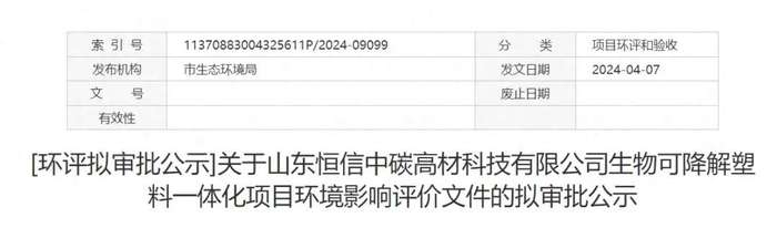 4月7日,邹城市人民政府官网发布,关于山东恒信中碳高材科技有限公司生物可降解塑料一体化项目环境影响评价文件的拟审批公示: