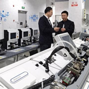 题图说明:建行员工实地走访昊丰医疗生产车间。 专题