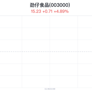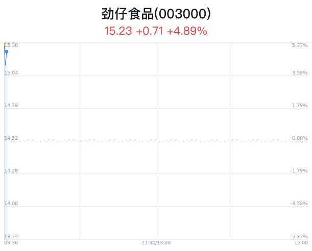 04月11日,劲仔食品(003000)股价大幅上涨,截至09点30分,劲仔食品上涨5.37%,报15.30元/股,创近12月新高,成交1334万元,换手率0.29%。