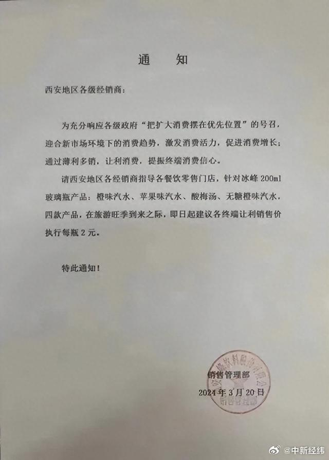 据西安网,近期,一张盖有“西安冰峰饮料股份有限公司销售管理部”印章的通知显示,建议西安地区各经销商指导各餐饮零售门店对橙味汽水等多款产品降价至每瓶2元,落款时间为2024年3月20日。另据冰峰工作人员向西部网回复,“2元优惠价格只是阶段性调价”。记者走访西安市翠华路上部分餐饮门店,均表示目前冰峰售价仍为3元,并未听说降价通知,一位门店主表示:“进货价都没有降,我们也不好作调整。”
