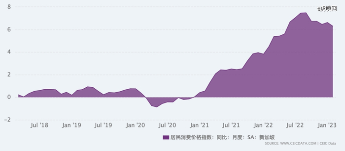 衡量通货膨胀的一种常用方法是使用消费者物价指数(CPI),图为2018年-2023年新加坡CPI变化。图片来源:CEIC DATA