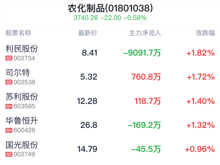 从个股上来看,该行业的成分股中,利民股份涨1.82%,司尔特、苏利股份、华鲁恒升涨幅居前。