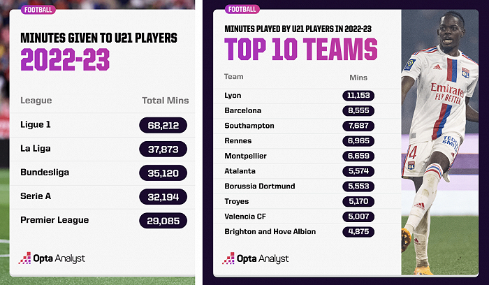 一直以来,法甲联赛都以自身的优秀青训著称,Opta统计,上赛季20家法甲俱乐部总共为21岁以下球员提供了68212分钟的出场时间,这比英超联赛和意甲联赛的总和还要多;五大联赛中,U21球员上场时间的前20名俱乐部中有八家来自法甲,其中里昂遥遥领先。