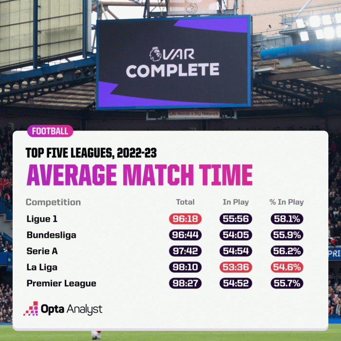 这自然离不开法甲联赛优秀的竞技水平和良好的观赏性。一般情况下,「净比赛时长」高,意味着比赛的质量水平和流畅程度也相对较高,而根据Opta统计,上赛季五大联赛中法甲净比赛时间占比最高。