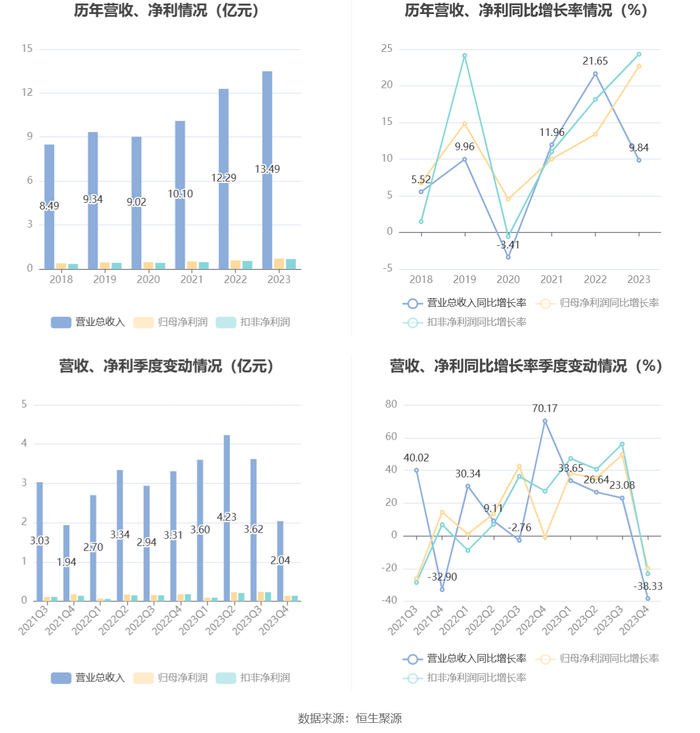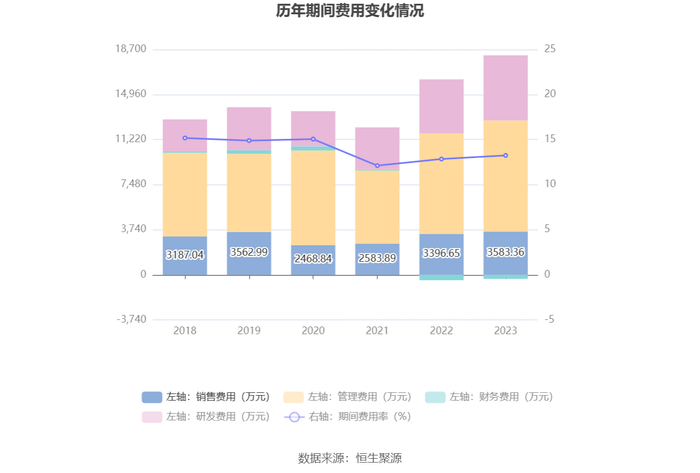 2023年,公司期间费用为1.79亿元,较上年同期增加2102.62万元;期间费用率为13.24%,较上年同期上升0.40个百分点。其中,销售费用同比增长5.5%,管理费用同比增长10.53%,研发费用同比增长20.69%,财务费用由去年同期的-444.79万元变为-332.99万元。