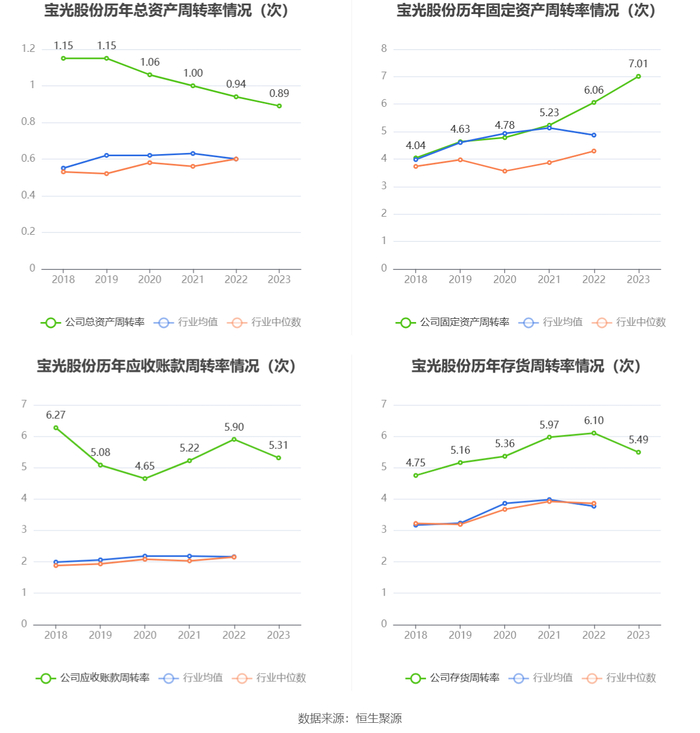 营运能力方面,2023年,公司公司总资产周转率为0.89次,上年同期为0.94次(2022年行业平均值为0.60次,公司位居同行业3/31);固定资产周转率为7.01次,上年同期为6.06次(2022年行业平均值为4.87次,公司位居同行业12/31);公司应收账款周转率、存货周转率分别为5.31次、5.49次。