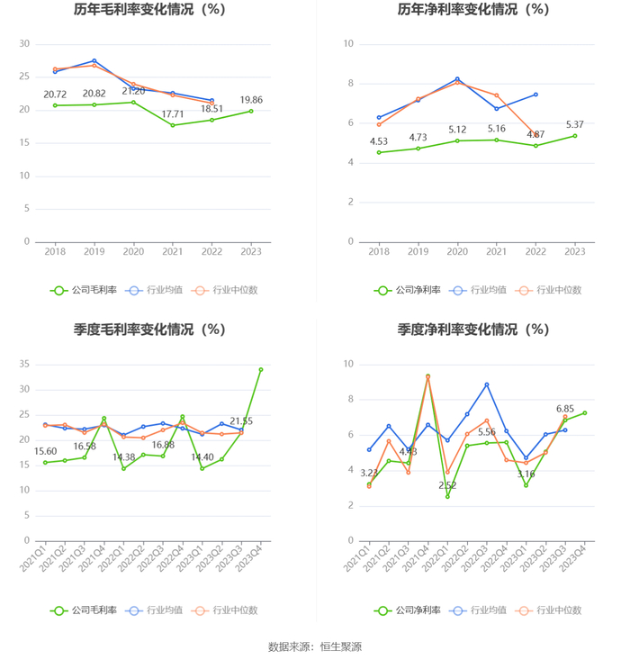 2023年,公司毛利率为19.86%,同比上升1.35个百分点;净利率为5.37%,较上年同期上升0.50个百分点。从单季度指标来看,2023年第四季度公司毛利率为34.00%,同比上升9.29个百分点,环比上升12.45个百分点;净利率为7.26%,较上年同期上升1.66个百分点,较上一季度上升0.41个百分点。