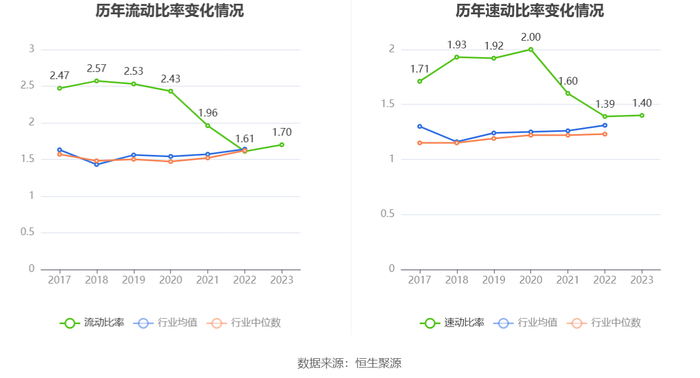2023年,公司流动比率为1.70,速动比率为1.40。