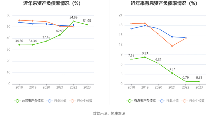 在偿债能力方面,公司2023年年末资产负债率为51.95%,相比上年末下降2.94个百分点;有息资产负债率为0.78%,相比上年末下降0.01个百分点。