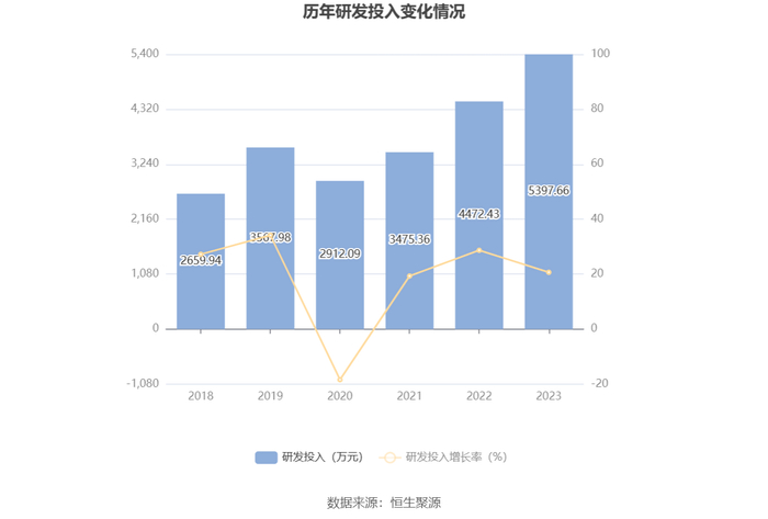 2023年全年,公司研发投入金额为5397.66万元,同比增长20.69%;研发投入占营业收入比例为4.00%,相比上年同期上升0.36个百分点。此外,公司全年研发投入资本化率为0。