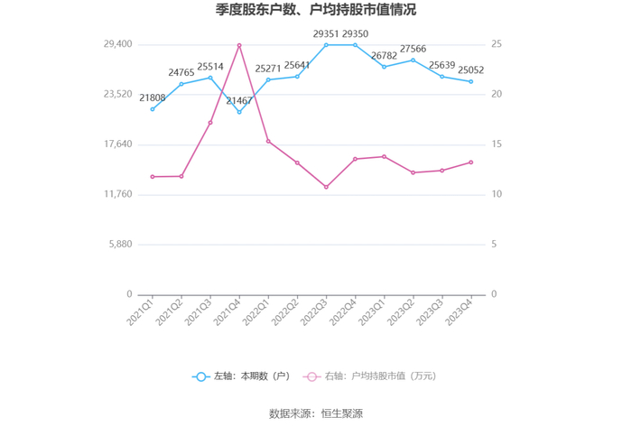 筹码集中度方面,截至2023年年末,公司股东总户数为2.51万户,较三季度末下降了587户,降幅2.29%;户均持股市值由三季度末的12.43万元上升至13.25万元,增幅为6.60%。