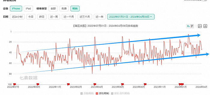 我们很少见到一款产品,在上线近两年之后依旧保持着稳定上升曲线的产品,七麦的数据显示,从第一年上线长期位居畅销榜40-60位左右后,去年产品已经稳定在了畅销榜前20-40位,成为了FPS手游中的头部产品之一。