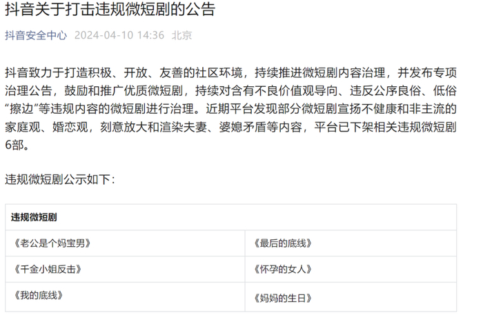 当日,抖音安全中心发布关于打击违规微短剧的公告。公告称,近期平台发现部分微短剧宣扬不健康和非主流的家庭观、婚恋观,刻意放大和渲染夫妻、婆媳矛盾等内容,平台已下架相关违规微短剧6部。