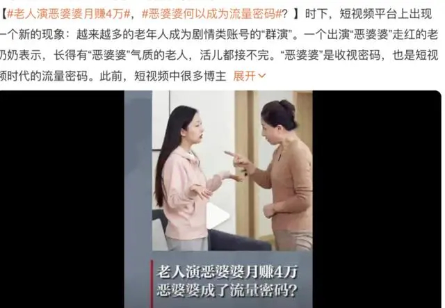 一位老年人短剧演员接受媒体采访时表示,“恶婆婆”是短视频平台上最抢手的老人类型之一,长相凶悍、性格泼辣、有“恶婆婆”气质的群演,往往有接不完的活儿。