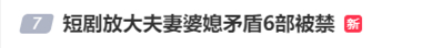 4月10日晚上,#短剧放大夫妻婆媳矛盾6部被禁#话题冲上微博热搜。