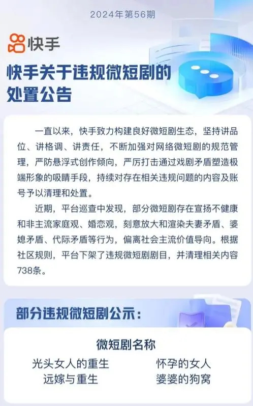 同日,快手也发布微短剧治理公告。公告称近期平台巡查中发现,部分微短剧存在宣扬不健康和非主流家庭观、婚恋观,刻意放大和渲染夫妻矛盾、婆媳矛盾、代际矛盾等行为,偏离社会主流价值导向。根据社区规则,平台下架了违规微短剧剧目,并清理相关内容738条。部分违规微短剧公示:《光头女人的重生》《怀孕的女人》《远嫁与重生》《婆婆的狗窝》。