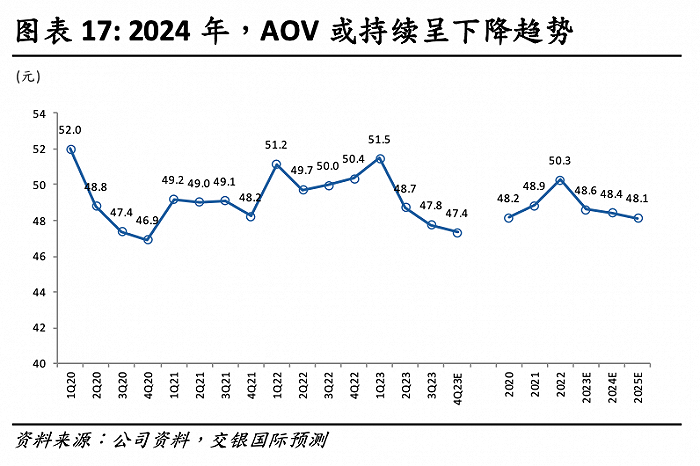 交银国际估算,美团外卖2023 年 GTV 达到 9400 亿元,增长 18%,外卖单均价格(AOV)2023 年则呈下降趋势,且这种势头在2024年会继续持续。这主要受到复常后低客单价商家恢复营业,以及美团外卖推出的拼好饭(客单价 5-15 元)业务影响。