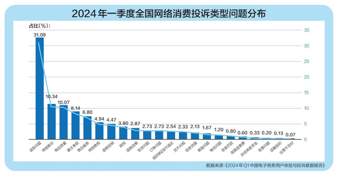 商务部确定2024年为“消费促进年”。中央经济工作会议提出,2024年要着力扩大国内需求,推动消费从疫后恢复转向持续扩大。与2023年相比,2024“消费促进年”的重点新增了培育壮大新型消费,支持直播电商、即时零售等新业态新模式健康发展,激发数字消费活力。也正是因此,新型消费的高质量发展和推进成为今年以来消费市场的“重头戏”。早在1月,中国消费者协会就提出,2024年全国消协组织消费维权年主题为“激发消费活力”。与此同时,近日,依据网络消费纠纷调解平台“电诉宝”2024年一季度受理的全国100家互联网消费平台纠纷案例数据,网经社电子商务研究中心发布了《2024年Q1中国电子商务用户体验与投诉数据报告》(以下简称《报告》)。不难看出,网络消费市场中的新老问题依然困扰着消费者,并成为影响新型消费提质扩容的瓶颈之一。