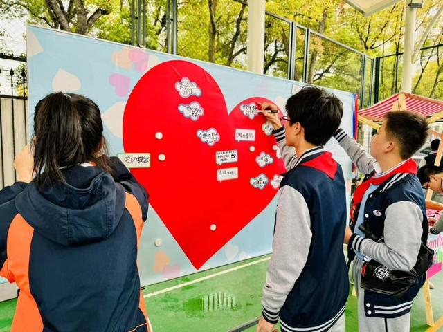 与此同时,在“情绪”小铺前,学生们把最符合自己当下情绪的关键词写出来,贴上“爱心情绪墙”。不一会儿,一整面墙就被贴的满满当当。