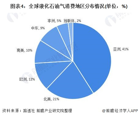 从消费市场区域分布来看,全球液化石油气主要消费区域集中于亚洲地区。2019年液化石油气消费量最大的区域为亚洲,消费量约占全球液化石油气消费量的41%;其次为北美地区,消费量约占全球液化石油气消费量的21%。