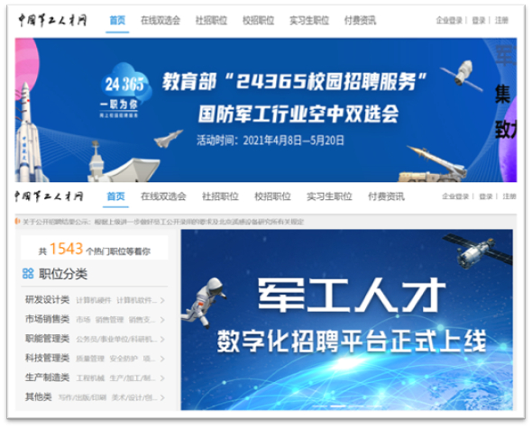 依托自主研发的军工人才网,整合各类服务资源,构建垂直的招聘管理与服务体系,以国防军工单位和人才为服务对象,紧扣军工相关行业、企业人才需求,构建“一网建设、双轮驱动”的运作模式,提供具有融合特色、专业化的全流程、数字化招聘服务,营造良好的人才交流合作生态。