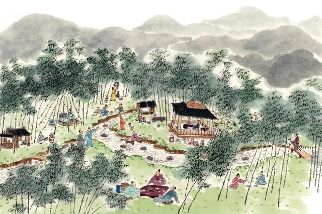 “此地有崇山峻岭,茂林修竹,溪流激湍,映带左右,引以为流觞曲水,列坐其次,虽无丝竹管弦之盛,一觞一咏,亦足以畅叙幽情。”晋穆帝永和九年,会稽内史王羲之宴请文人名士四十一人于兰亭,修祓禊之礼,写下了举世闻名的《兰亭集序》,在这部千古名篇中,就出现了“曲水流觞”的记载,这是一种魏晋之时上层社会中流行的风雅的上巳节游戏。