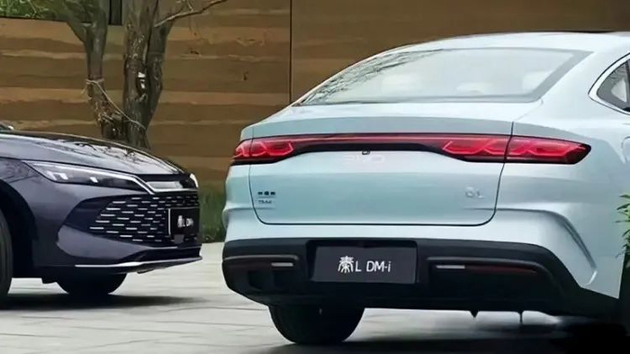 外观方面,秦L基本延续了家族式设计语言,与秦系列看起来差别不大。大尺寸进气格栅与新款宋Pro DM-i上的保持一致,细节有所区别,除了新增了熏黑处理外,大灯组也变得更有视觉冲击力了。车尾配备了全新的贯穿式尾灯,细节上采用了更有辨识度的“中国结”造型,秦PLUS上的中置英文车标在秦L上则改为了全新的“BYD”字母标识。