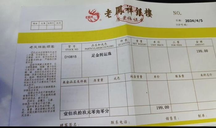 “你如果是从网上买的金饰,想要来清洗保养,我们不仅要看品牌刻印,还得看票,确定票是对的才可以。”老凤祥蓝色港湾店经理口中的“票”,即珠宝黄金的质保单,可以从中获知黄金的成色、重量、价格、销售方等基本信息。