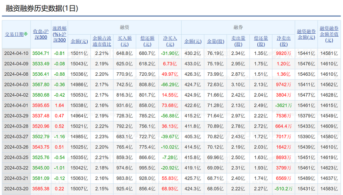 东方财富Choice金融终端数据显示,截至2024年4月10日,沪深京三市融资融券余额15441亿元,其中融资余额为15011亿元,4月10日当天,A股发生648.8亿元融资买入,680.7亿元融资偿还。