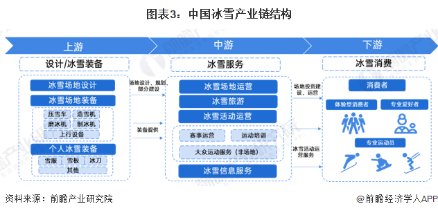 冰雪产业链上游为场地设计与装备,装备供应包括冰雪场地装备、个人装备供应,主体包括场地设计、装备供应企业、个人冰雪装备供应企业;中游为冰雪场地运营、冰雪旅游、冰雪信息服务以及冰雪活动运营等,其中,冰雪活动运营具体包括赛事、运动培训等服务;下游为参与冰雪产业活动的消费者。