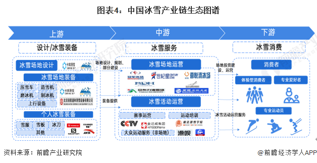 中国冰雪产业链上游包括卡宾滑雪、北京奔流公司、娅豪集团等冰雪场地设计企业以及场地装备供应企业;包括安踏、零夏、探路者等个人冰雪装备供应企业。中游包括冠军冰场、世纪星、等冰雪场地运营企业;包括奥悦冰雪、万龙度假天堂等冰雪旅游服务企业;包括魔法滑雪学院、万域芳菲等冰雪活动运营企业;包括滑呗、乐冰雪等冰雪信息服务企业。下游主要为参与冰雪产业活动的消费者,可大致分为体验型消费者、专业爱好者和专业运动员。
