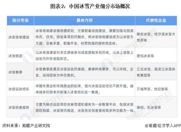 冰雪产业可细分为冰雪场地建设、冰雪旅游、冰雪赛事、冰雪运动培训及冰雪信息服务市场,其具体情况如下: