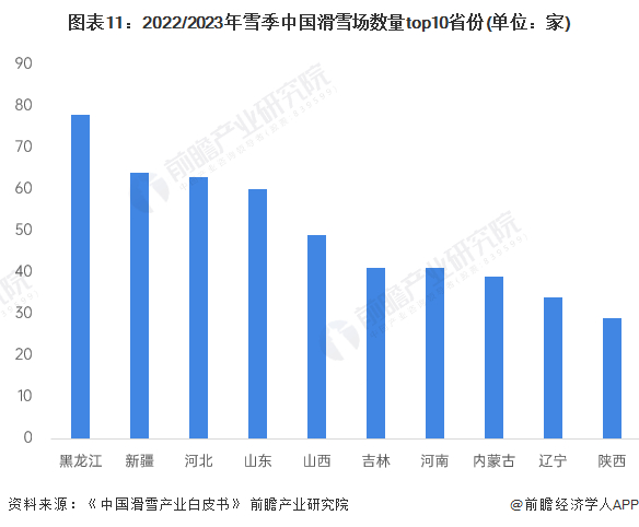 中国冰雪资源主要集中在北方,东北三省冰雪文化底蕴丰厚。2022/2023年雪季期间,黑龙江拥有全国最多滑雪场,数量高达78家。新疆、河北的滑雪场数量也均超过60家。