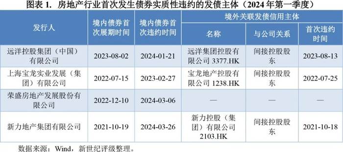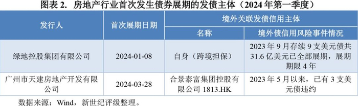 2024年第一季度债券市场出险房企呈现平稳出清态势,信用风险事件主要集中于前期已展期的房企发生实质性违约,同时展期情况较上年回落,新增出险主体数量较少。具体来看,2024年第一季度新增实质性违约房企分别为远洋中国、宝龙实业、荣盛发展和新力地产等4家展期主体,其中新力地产、宝龙实业与远洋中国的间接控股股东已分别于2021年10月、2022年7月和2023年8月发生境外债券违约。新增展期方面,2024年第一季度绿地控股、广州天建等2家主体首次发生债券展期。其中,绿地控股境外美元债已于2023年9月展期,广州天建则为境外债违约主体合景泰富集团(1813.HK)的境内子公司,2023年5月以来合景泰富集团已有多支美元债券违约。