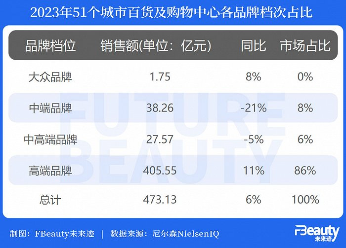 不断加深的高端化趋势正直接体现在销量数字上。数据显示,在51个城市的百货及购物中心的总体销售额中,高端品牌占比依旧最高,以405.55亿元的销售额占比86%,且还有扩张之势,同比上涨了11%。
