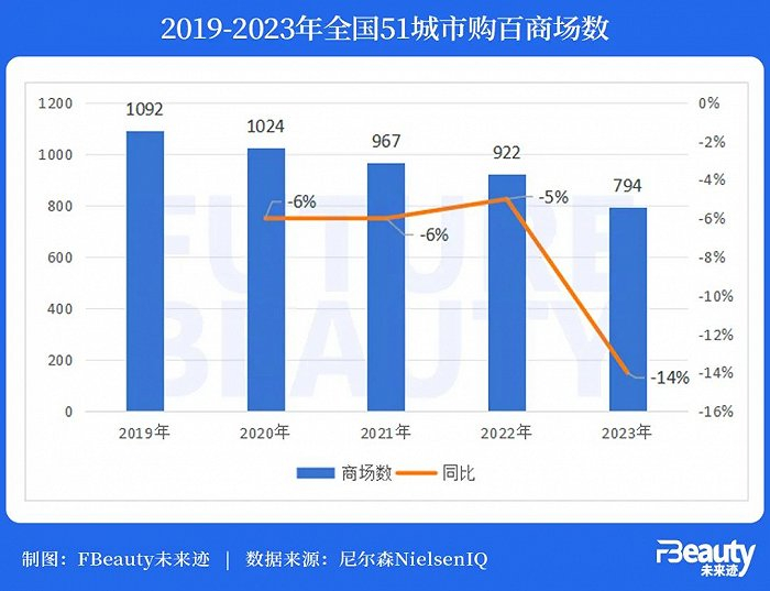 尼尔森NielsenIQ独家提供给《FBeauty未来迹》的数据显示,全国51个城市的百货购物中心化妆品柜台总数,从2019年3月到2023年直接减少了近6000个。