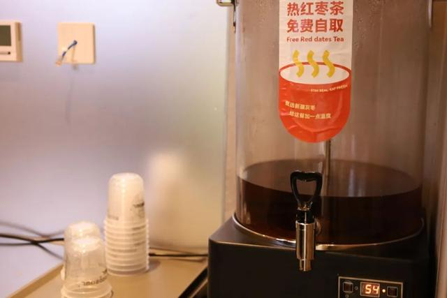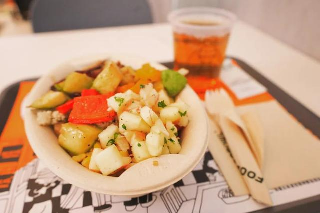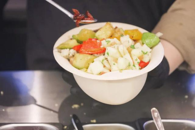 最让人期待的尝味环节来咯!捧过来装满食材、用可回收材料制作的碗,拿来免费自取的热红枣茶,坐在桌前拌匀辣酱,混合不同食材,用勺子舀起一勺送入口中,迎来的是意料之外的口味——不是冷硬硬的口感,而是热乎乎的“中式料理”,难怪有网友形容其为“盖浇饭”。与此同时,由于采用了比较健康的烹饪方式,口味比较清淡,没有很重的油腻感,能尝到食物本身的味道。