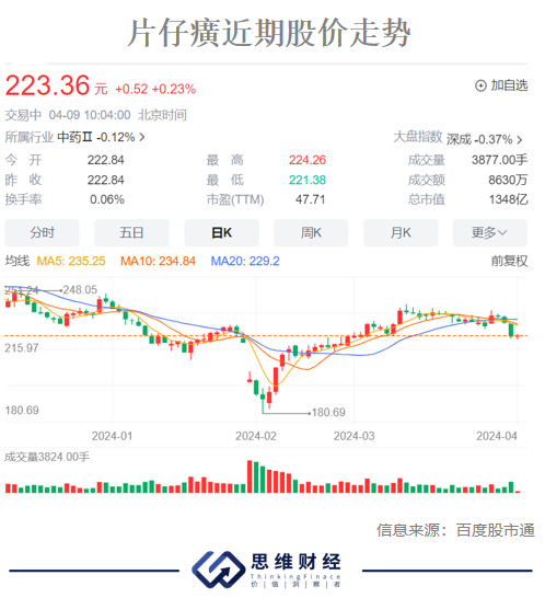二级市场方面,2021年年中,片仔癀坐上了“中药第一股”的宝座,总市值一度飙升至3000亿元。截至4月8日报222.84元/股,市值1358亿元,滚动市盈率48倍。