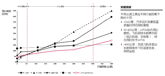 图5:不同里程下,eVTOL与火车、汽车和飞机耗时对比