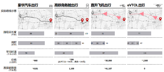 根据保时捷管理咨询数据,以上海-苏州约80-90km的中短途出行为例,与汽车、高铁等相比,eVTOL高效便捷;与直升机相比,eVTOL具有明显的成本和环保优势。